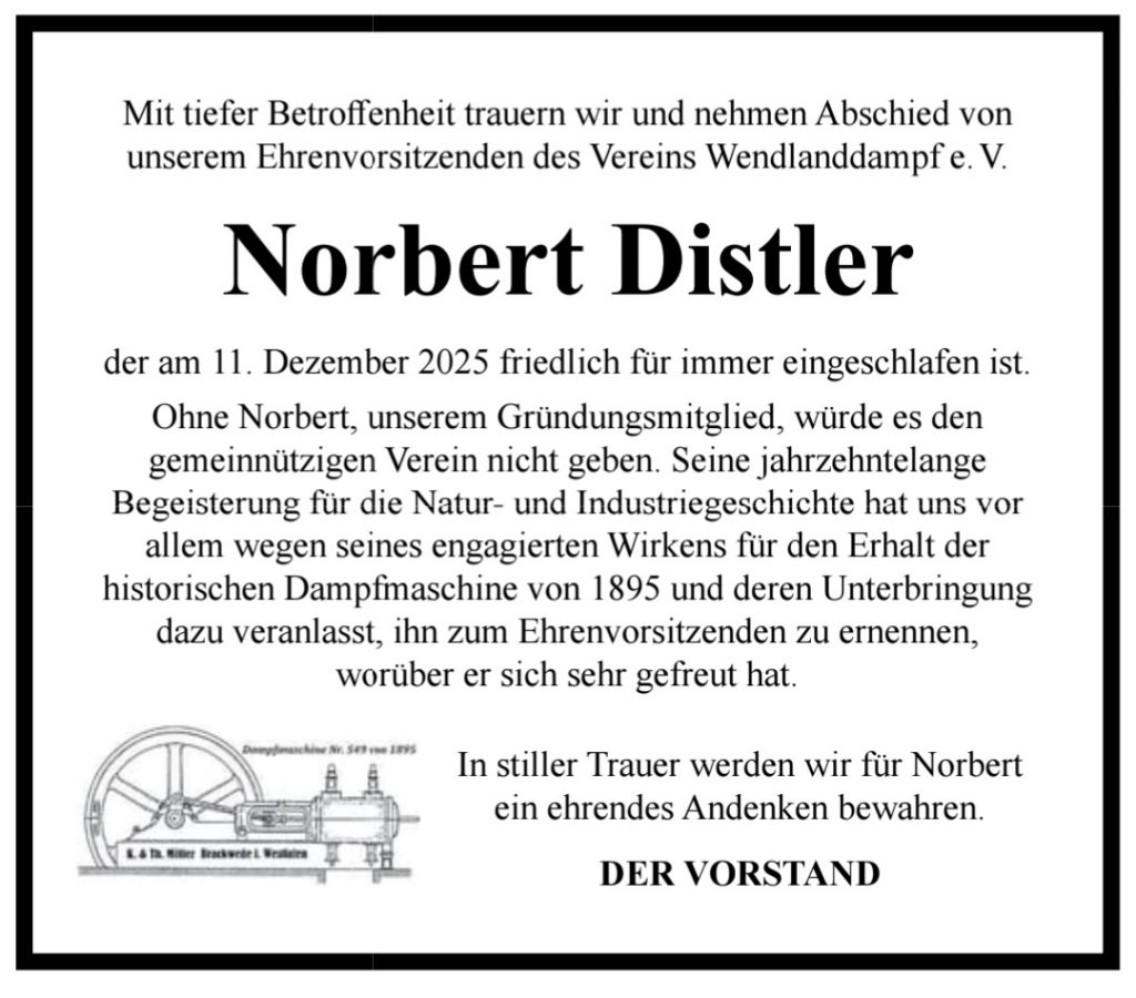 „Ein Leben für Heimatkunde, Technik und das Wendland – Mit dem Tod von Norbert Distler aus Bussau verliert das Wendland eine prägende Persönlichkeit“. So lautet zutreffend die Überschrift von Petra Witte zum Nachruf von Norbert in der Elbe-Jeetzel-Zeitung (EJZ) vom 05. Januar 2026