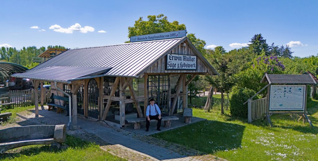 © Foto: Heino Wesch – Maschinenhaus und Schaukasten mit Infos zur Geschichte der historischen Dampfmaschine Nr. 549 von 1895 Besuchergruppen vor Ort [mehr … >>]
